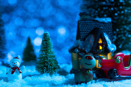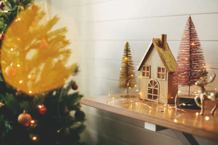 Stylish christmas wooden house, glitter christmas tree and golden reindeer in festive lights. Miniature fairy village, modern festive decor in scandinavian room. Merry Christmas