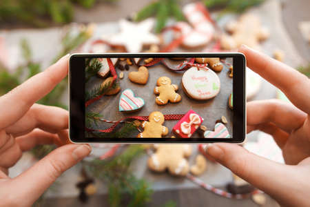 Hands taking picture of gingerbread cookies. Close-up photo of smartphone photographing traditional Christmas treat assortment. Food photography concept