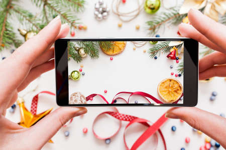 Christmas decoration photography on smartphone. Close-up of female hands holding mobile phone with festive trumpery, citrus and xmas tree