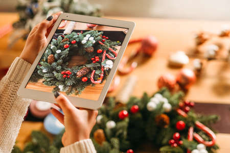 Florist hobby. Cropped shot of lady using tablet to take picture of Christmas fir tree wreath. Blur workplace background.