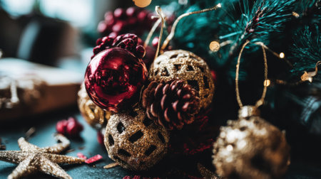 A close up view of shiny red and intricate gold Christmas ornaments hanging on a festive evergreen tree. A starfish ornament rests nearby creating a warm holiday atmosphere.
