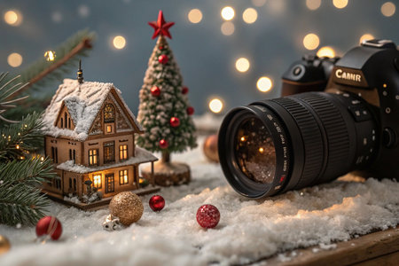 Festive Christmas scene with miniature house, tree, and camera lens.