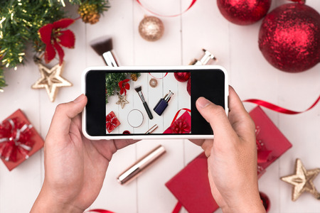Hands holding mobile taking photo of christmas make up cosmetics products