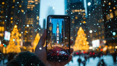 A hand holds a phone capturing a snowy New York City night