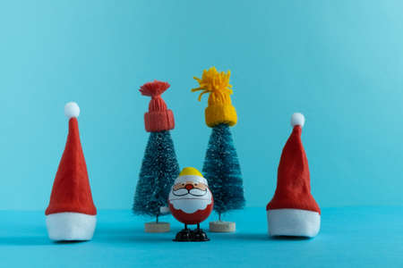 Santa Claus, gift and Christmas trees in winter hats on a blue background. New year concept. Merry Christmas. Happy new year 2022.