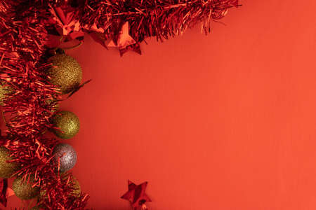 Shiny Christmas balloons with red tinsel on a red background, top view, copy space.