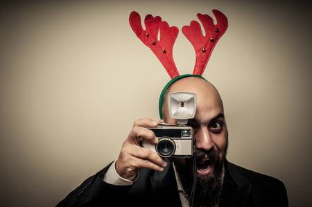 christmas bearded man holding old camera on grey background