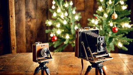 Evoke warmth and nostalgia this holiday season, capturing cherished moments with vintage cameras beside a twinkling Christmas tree.