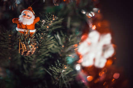 Close up of part of Christmas tree with different christmas toys and garland on street in evening city. Coniferous tree with decorative decorations to create festive mood.