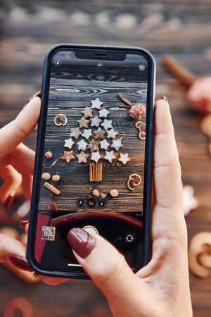 Christmas celebration mood. Woman hands taking photography of gingerbread cookies on table with phone. Smartphone photo for social networks post.