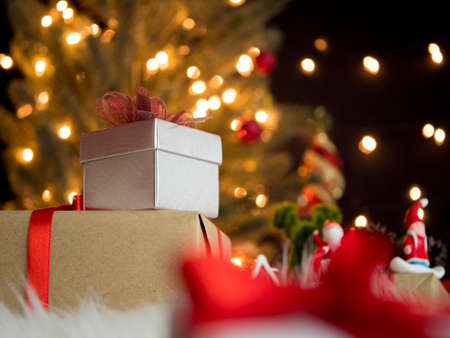Close up decoration santa claus dolls and christmas gifts isolated on bokeh background