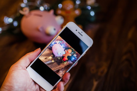 Shooting on the phone Christmas business still life with a piggy bank and a garland with lanterns. Hand holding a smartphone. Learning to take photos on your phone