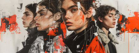 Monochrome and Red Androgyny Collage: Artful Models Merged with Abstract Expressionist Flair