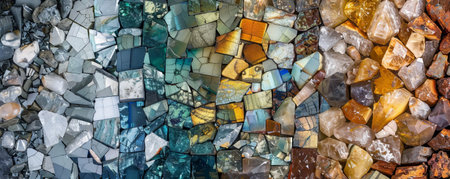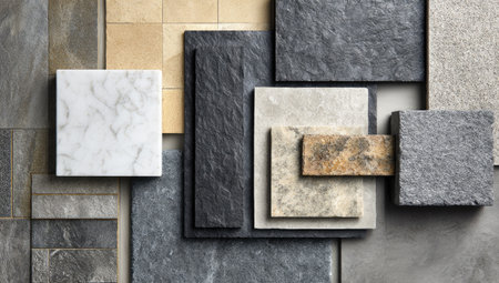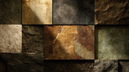 High-angle, close-up view of various stone tiles arranged in an abstract pattern. Different shades and types of stone are visible, including marble, slate, and granite. The tiles are arranged in overlapping layers, creating a visually appealing composition. The image showcases the diverse range of colors, textures, and patterns achievable with natural stone.