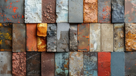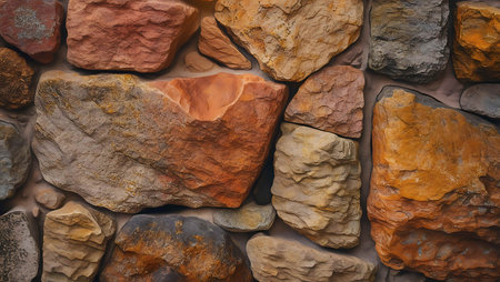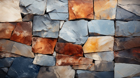abstract rocks brick wall wallpaper stock photo featuring a captivating composition. the style combines dark sky-blue and light orange hues, creating a naturalistic realism. the wall sculpture and installation showcase glazed surfaces in light maroon and dark gray tones. this outdoor art piece is visually striking and adds an eye-catching element to any space. ai generated