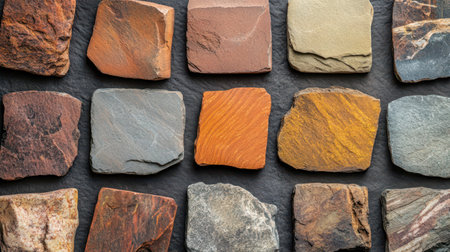 Various natural stone tiles display an array of colors and textures, laid out in an organized pattern on a dark surface, showcasing their unique qualities and natural beauty.