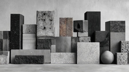 This image features an artistic arrangement of various geometric blocks in monochrome colors, showcasing texture and design suitable for modern and minimalist themes.