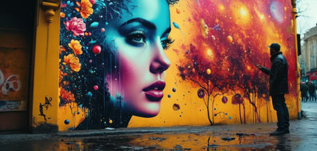 Vibrant street art portrait of a woman with bold colors and intricate details