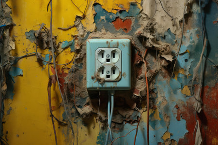 A striking composition featuring electric outlets and cables against vibrant yellow, turquoise, and red walls. This image showcases modern design and functionality.