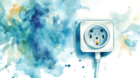 A power outlet is creatively illustrated with vibrant watercolor splashes around it, symbolizing the connection between energy and creativity in contemporary design.