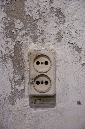 The electrical socket on the yellow cement wall, power supply, electrical outlet