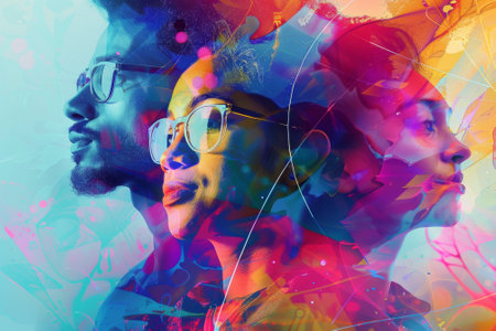 Vibrant portrayal of a diverse team with colorful overlay enhancements