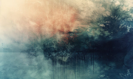 A man's head is shown in a watercolor painting of a lake. The man's face is distorted, and the water is a mix of blue and green. The painting has a serene and calming mood