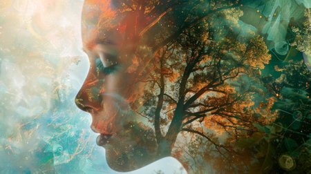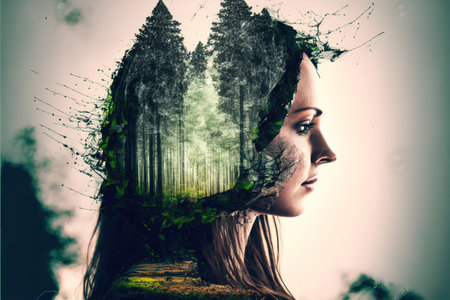 two exposures, harmony of people and nature, finding oneself, portrait of a woman, banner with copy space made with Generative AI
