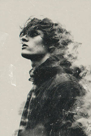 Male figure with messy hair looks skyward, enveloped in a dreamlike atmosphere with soft textures and muted colors, evoking a sense of contemplation and creativity