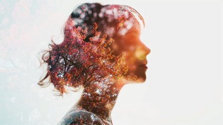 Surreal Portrait of Woman Blending with Autumn Nature Imagery in Double Exposure Effect AI Generative