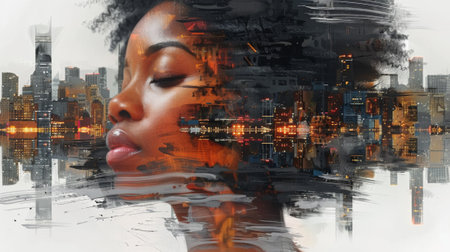 A womans face is superimposed on a cityscape background, creating a striking double exposure effect. The womans features are clear against the buildings and streets of the city in the background.