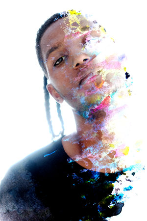 A double exposure portrait of a black man combined with watercolor spots.