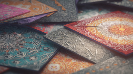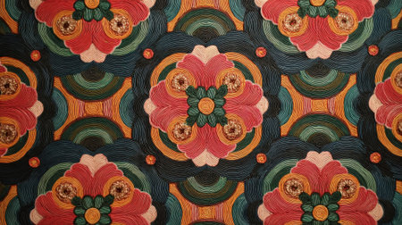 This decorative design showcases intricate floral patterns with vibrant swirls and rich colors. The combination of reds greens and yellows creates a lively and attractive ambiance.
