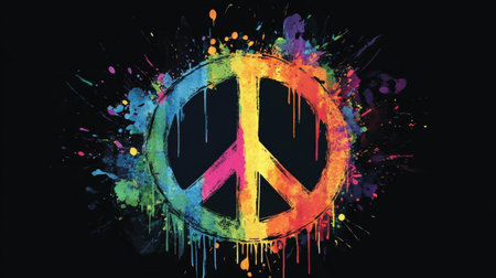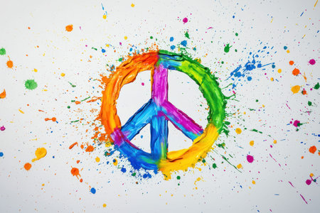A Colorful paint splatters form vibrant peace sign, symbolizing rights activism and unity