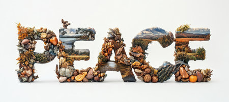 Word PEACE Made of Tranquil Landscape Photos, Nature and Peace Concept, White Background