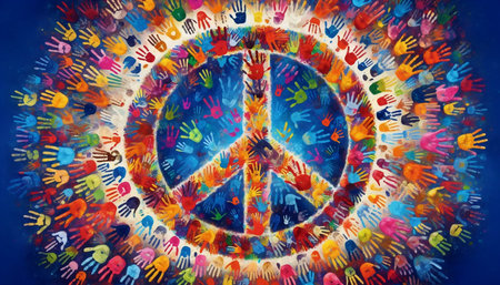 Colorful handprints forming peace symbol on canvas, Ai generated image