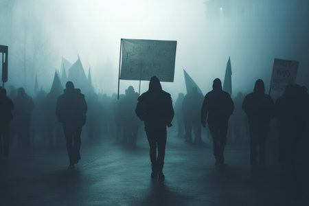 Silhouetted figures of protesters hold banners high amidst fog, advocating for social change in a powerful evening display of activism.