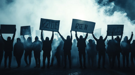 Banners are raised by silhouetted protesters in a foggy environment as they advocate for social change during an evening gathering filled with passion.