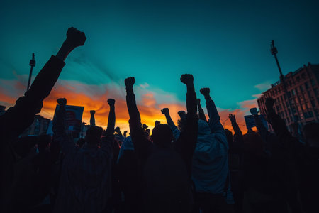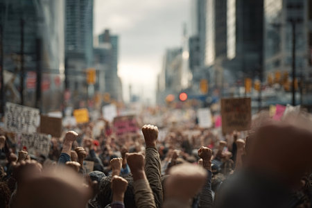 Large group of diverse individuals raising fists in solidarity during a city protest. Skyscrapers line the background, capturing the energy and unity of a social movement advocating for change