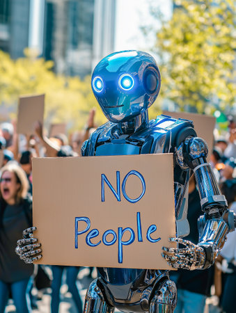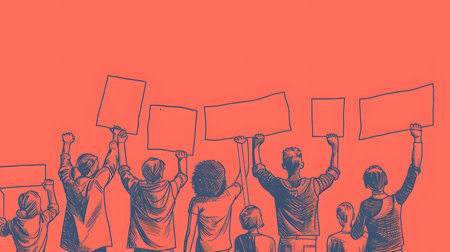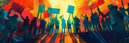 Vibrant protest unfolds in a bustling city street, with a diverse crowd raising fists and holding signs. Tall buildings frame the scene, highlighting the collective call for change