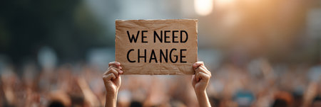 Protesters gripping cardboard sign reading we need change amid blurred crowd, representing social activism and public demonstration for societal transformation