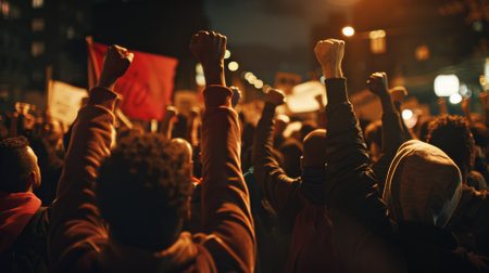 Group of protesters with their fists raised up in the air. Activists protesting on the street. People publicly demonstrating opposition. Gloomy city scenery. Generative AI.