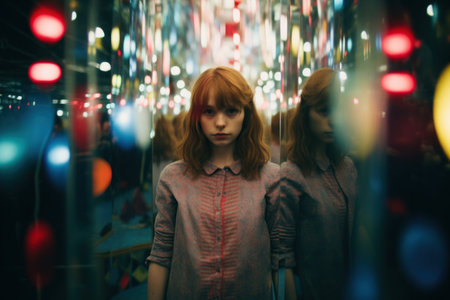 Young girl standing alone with colorful lights bokeh in background at night in urban setting. Surreal and dreamy atmosphere. Weirdcore aesthetic, nostalgic
