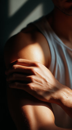 Naked muscular man's shoulder on white background