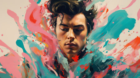 Creativity in art, artist working, colorful painting close up, focus on, copy space Vivid and vibrant tones Double exposure silhouette with artist and artwork