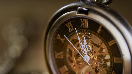 Golden antique elegant pocket watch ticking, five minutes to midnight, on a blurred background, extreme close up shot. New Years Eve countdown concept.
