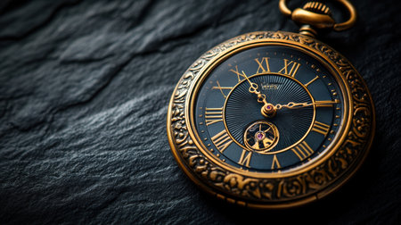 Elegant close-up of a vintage golden pocket watch on dark textured background, symbolizing time, luxury, and New Year countdown.
