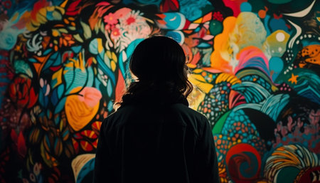 A person stands in front of a vibrant abstract painting, engaging with the creative expression in a contemporary gallery, experiencing emotions of modern art.