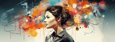 This striking digital artwork features a human face in profile, blended with vibrant graphics and abstract elements that evoke creativity and imagination.