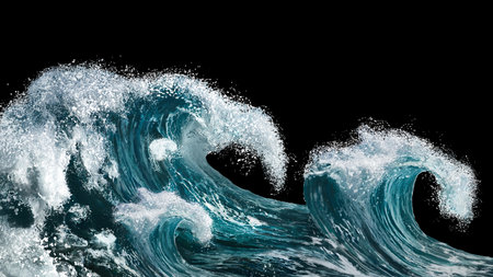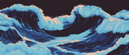 A vibrant, rolling sea crest erupts with force, its deep blue hues contrasted by a luminous sky, embodying the raw energy and mesmerizing allure of the ocean.